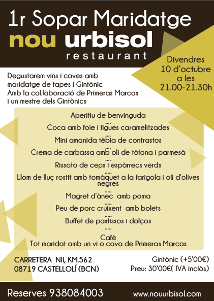 El proper divendres 10 d'Octubre farem el nostre primer sopar maridatge amb col·laboració de Primeras Marcas.Cada vi i el cava que es degustarà anirà acompanyat d'una tapa nostre.Hora: 21:00hPreu: 30,00€ (IVA inclòs)Reserves: 93.808.40.03info@nouurbisol.com
